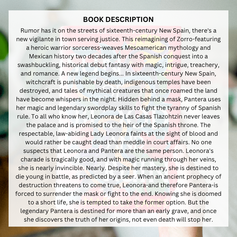 The book splits in half, the first tells the story of Leonora, a vigilante called Pantera, trying to bring down the Spanish tyranny in Mexico. She is trained in a magical world of gods and demons, and keeps her identity secret. Slated to marry a Spanish prince to unite her people, the plot is slightly political.